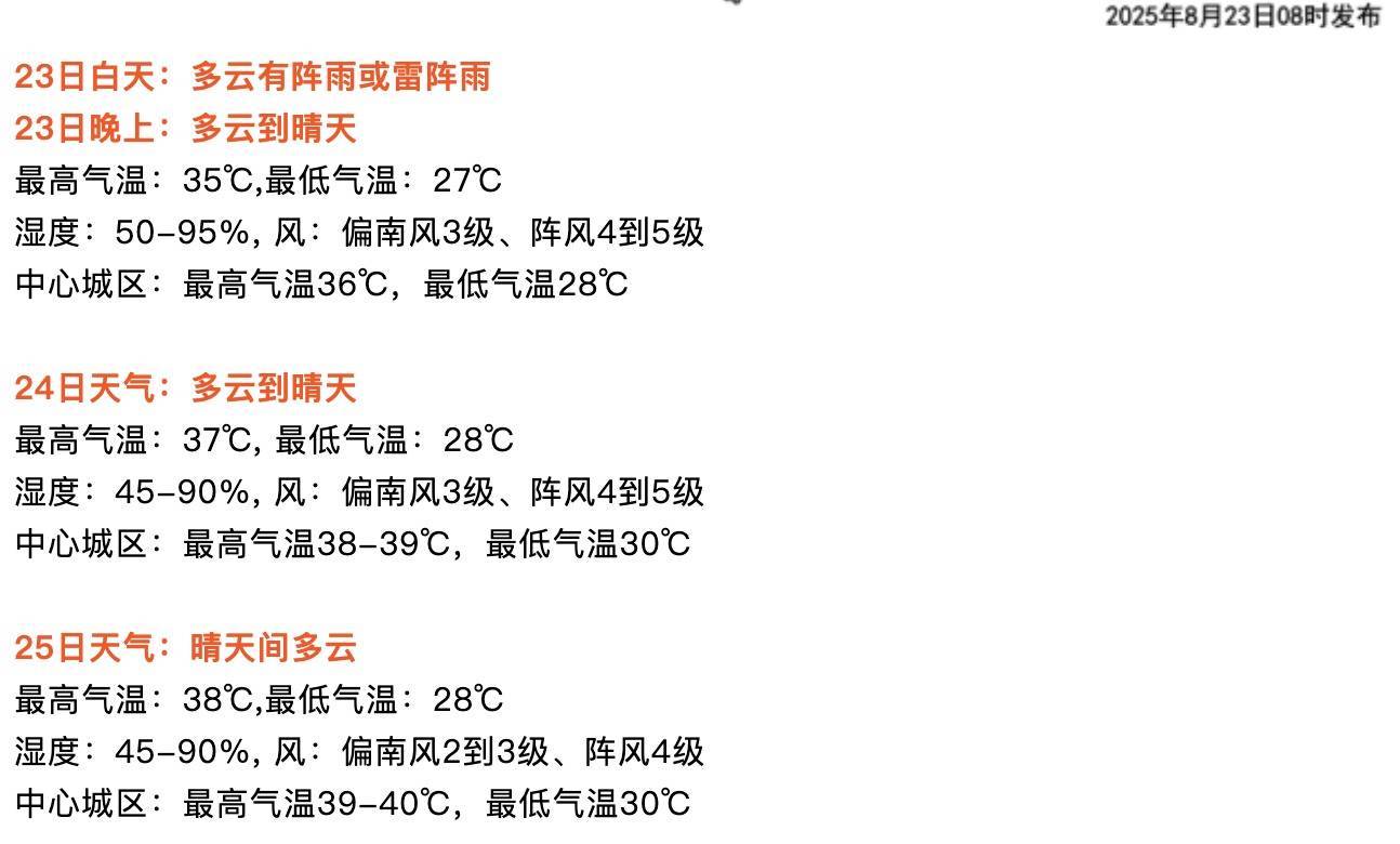湖北日报(记者汤炜玮、实习生任康中、通讯员陈声超)8月23日,武汉进入处暑,早晨武汉市微风拂面,气温清凉舒适。上午在阳光的照耀下,气温节节上升。预计今天武汉市局地仍有阵雨或雷阵雨,最高气温在35℃左右。明起阵雨“拜拜”,最高气温再度回升到38℃左右,局地可到39~40℃以上。