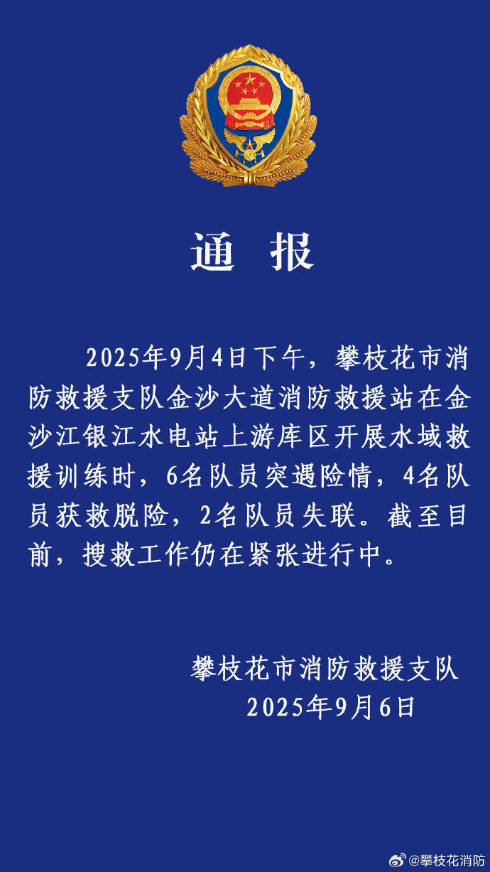 9月4日下午,攀枝花市消防救援支队金沙大道消防救援站在金沙江银江水电站上游库区开展水域救援训练时,6名队员突遇险情,4名队员获救脱险,2名队员失联。截至目前,搜救工作仍在紧张进行中。